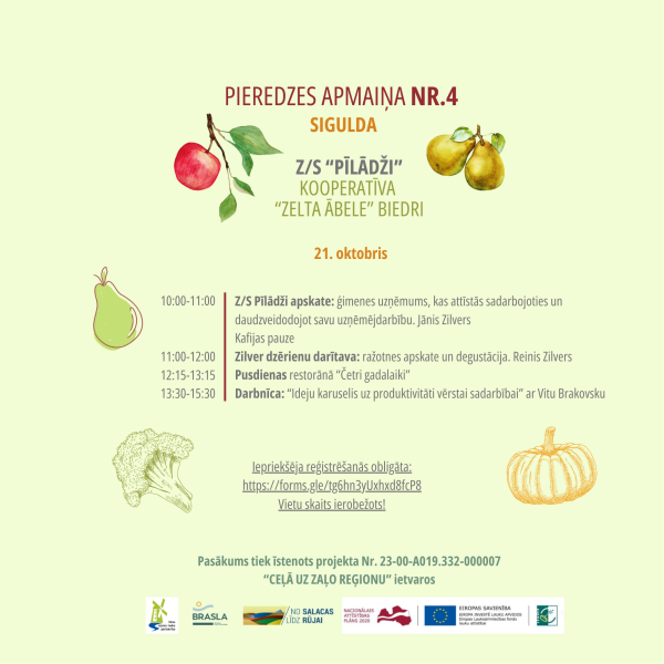 - Pasākuma ietvaros apmeklēsim augļkopības un stādu saimniecību Z/S “Pīlādži” Siguldas pusē — ģimenes uzņēmumu, kas attīstās, balstoties uz sadarbību un uzņēmējdarbības daudzveidību. Uzņēmums aktīvi piedalās kooperatīva “Zelta ābele” darbībā, nodrošinot savus ābolus skolām programmas “Skolas auglis” ietvaros. Tikšanās vieta: Z/S “Pīlādži”, Saltavota iela 30, Matiņi, Siguldas pagasts.